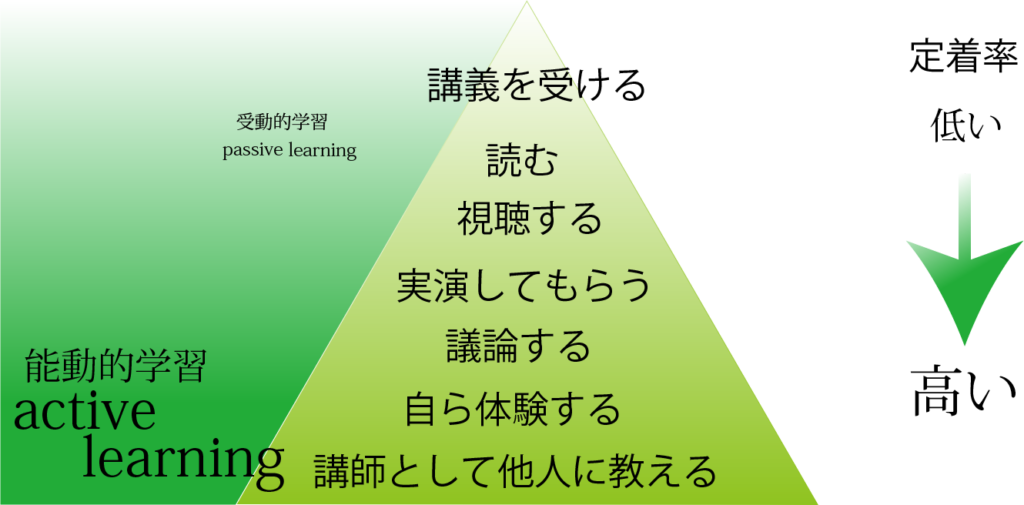 この授業システムの有効性の根拠となるのが、アメリカ国立訓練研究所(National Training Laboratories)の「ラーニングピラミッド」という有名な研究結果です。